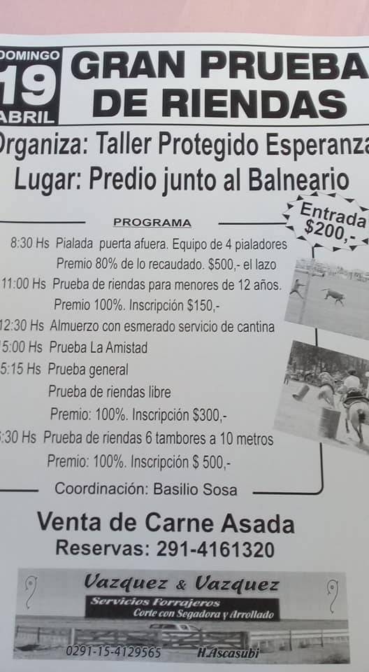 En Conferencia de Prensa, integrantes de la Comisión Directiva del Taller Protegido Esperanza, junto a Basilio Sosa, anunciaron hoy la realización de una Gran Prueba de Riendas a llevarse a cabo el domingo 19 de abril en el predio junto al Balneario. La entrada tiene un costo de 200 pesos.